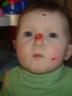 We had a pretty lazy day around here yesterday, so Mia got out her Valentine's Day loot and found a page of stickers. She's learning how to peel stickers off the sheet all by herself (manual dexterity, and all that) and hasn't been too good at it, so I paid no attention to what she was doing. Usually I step in when she gets overly-frustrated, but I kind of forgot she was doing it, because she was so quiet this time.